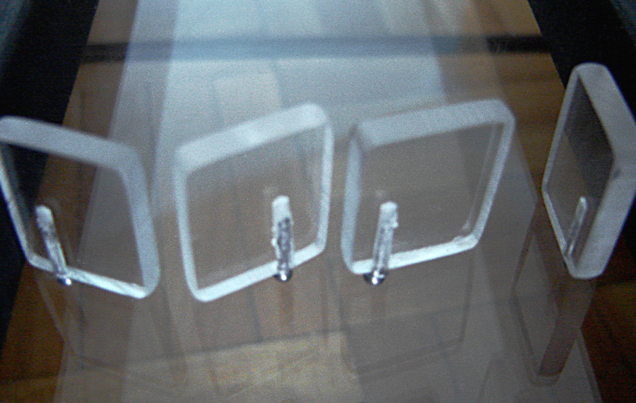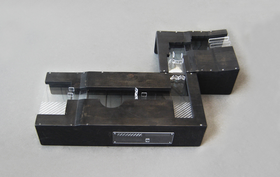 These modular units map a frequently confusing portion of the Montreal underground pathway from Bonaventure metro station to the Central Train Station. Major architectural and structural elements are demonstrated through the use of cut shapes in the wood, slope and height changes, texture changes in the plexiglass, and also small plexiglass components standing in for elements such as doors. A secondary layer of plexiglass (not visible in these pictures) act as a slot for placing textured paper maps of the same route. This allows the blind individual to form a better connection between the model and the transportable paper map, giving them a better spatial understanding than possible from textured paper maps only.