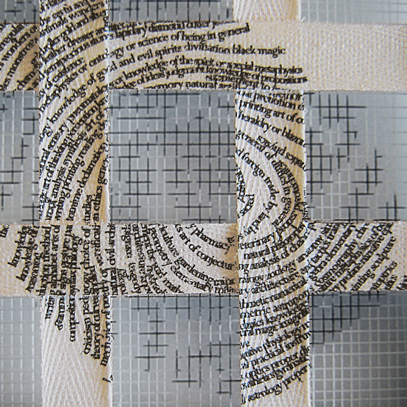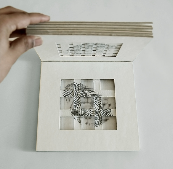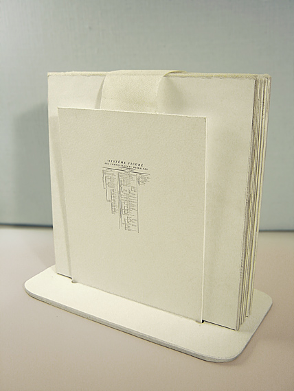 This interpretive bookwork comprises of an evolving human fingerprint composed of words from a diagram of system of human knowledge found in Denis Diderot's encyclopedia. As the reader browses through the book, the ridges of the fingerprint transforms from line drawings to legible words, while the pages holding the graphic change from plan unbroken paper to weaves paper, fabric, and finally strings.