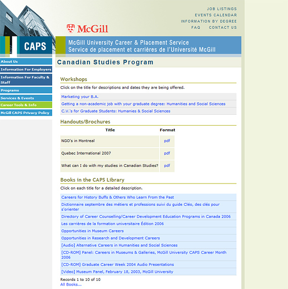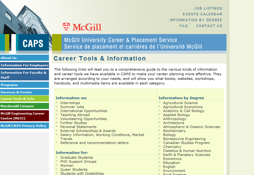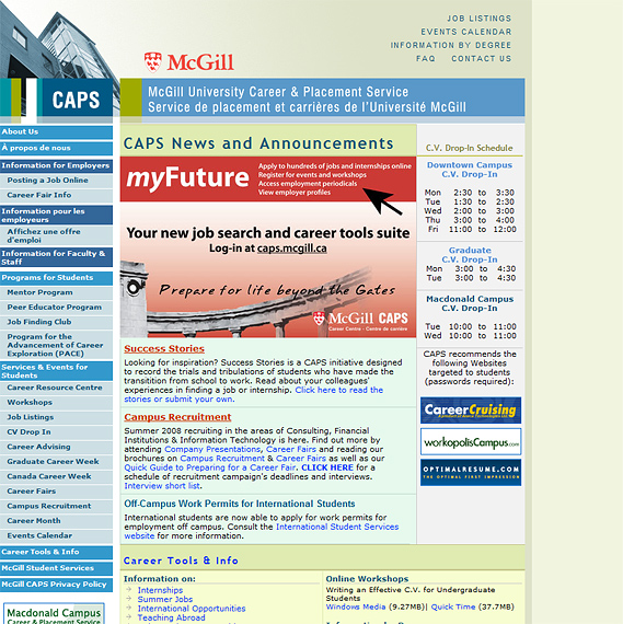 This design and development for McGill's Career & Placement Service, Canada's largest university career centre at the time, included a major information architecture overhaul according to guidelines for student counselling centres. In addition, new dynamic components were developed to keep the student more informed about the centre's activities, as well as make available online the centre's library catalog. Finally, the visual design was updated to reflect the new branding approach utilizing four shades of cool colors that were in contrast to the University's main emblem.